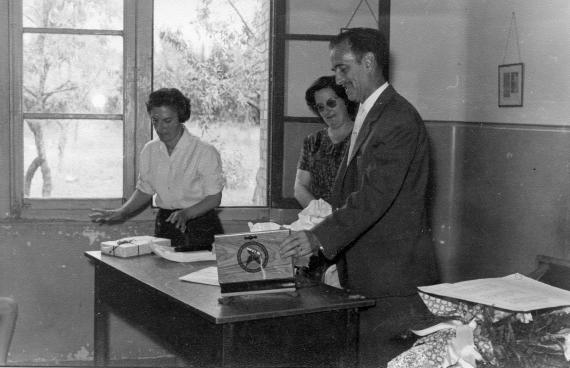 Escola. Any 1965.Despedida mestres: Mª de Miguel i Rafel Babí. Al mig Montserrat Vila. Escola 1965 Col·labora: aporta informació d'aquesta imatge