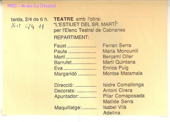 1987. Programa de l'obra de teatre: L'estiuet del senyor MartíTeatre 1987 Col·labora: aporta informació d'aquesta imatge