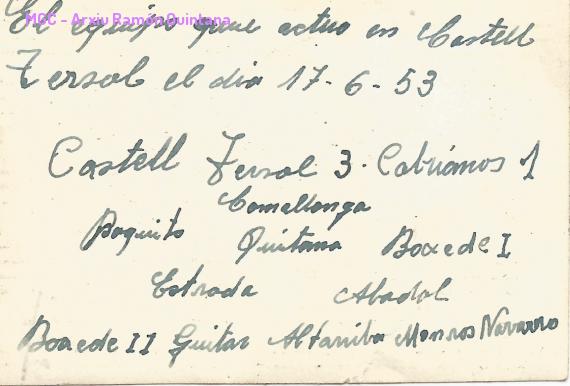 Revers de l'anterior fotografia. Com es pot veure hi ha la alineació amb la seva disposició al camp del F.C. Cabrianes. I també el resultat, un 3 a 1 pel Castellterçol.