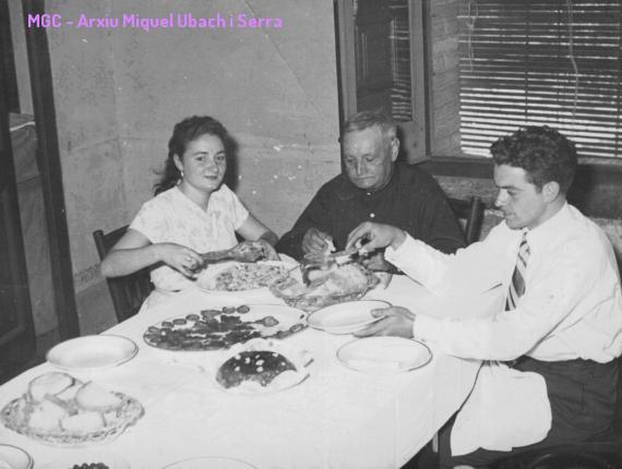Festa Gent Gran. Any 1957.2 de juny de 1957. Celebrant la Festa dels avis. Agnès Mitjans, Joan Serra i Miquel Ubach. Festa Gent Gran 1957 Col·labora: aporta informació d'aquesta imatge